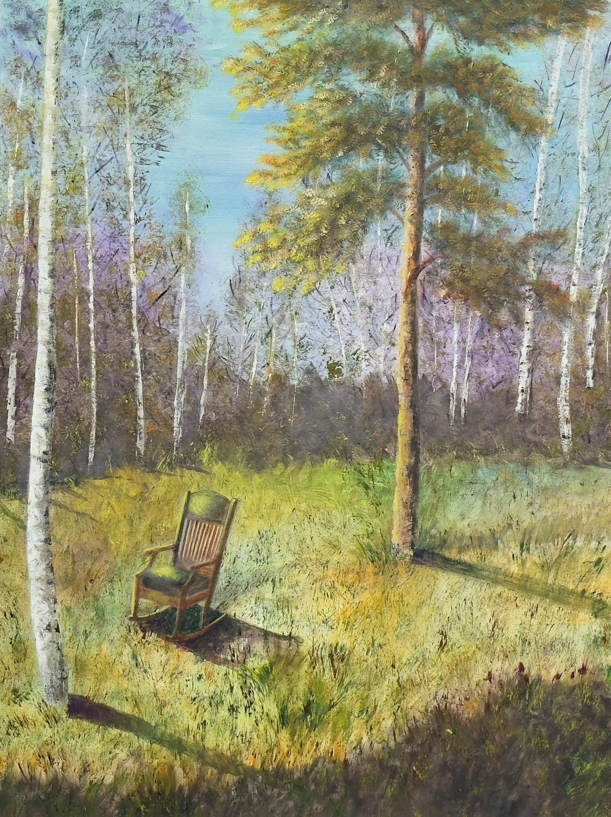 . Each chair in each painting was chosen specifically for the painting to tell a specific story some romance, some emptiness or loneliness, some regrowth or returning to it’s origin, some relaxation or timeout, some exploratory, some to talk about how we need to stop and smell the roses so to spea, to name a few. So why was each specific chair chosen? What story does it convey to you?